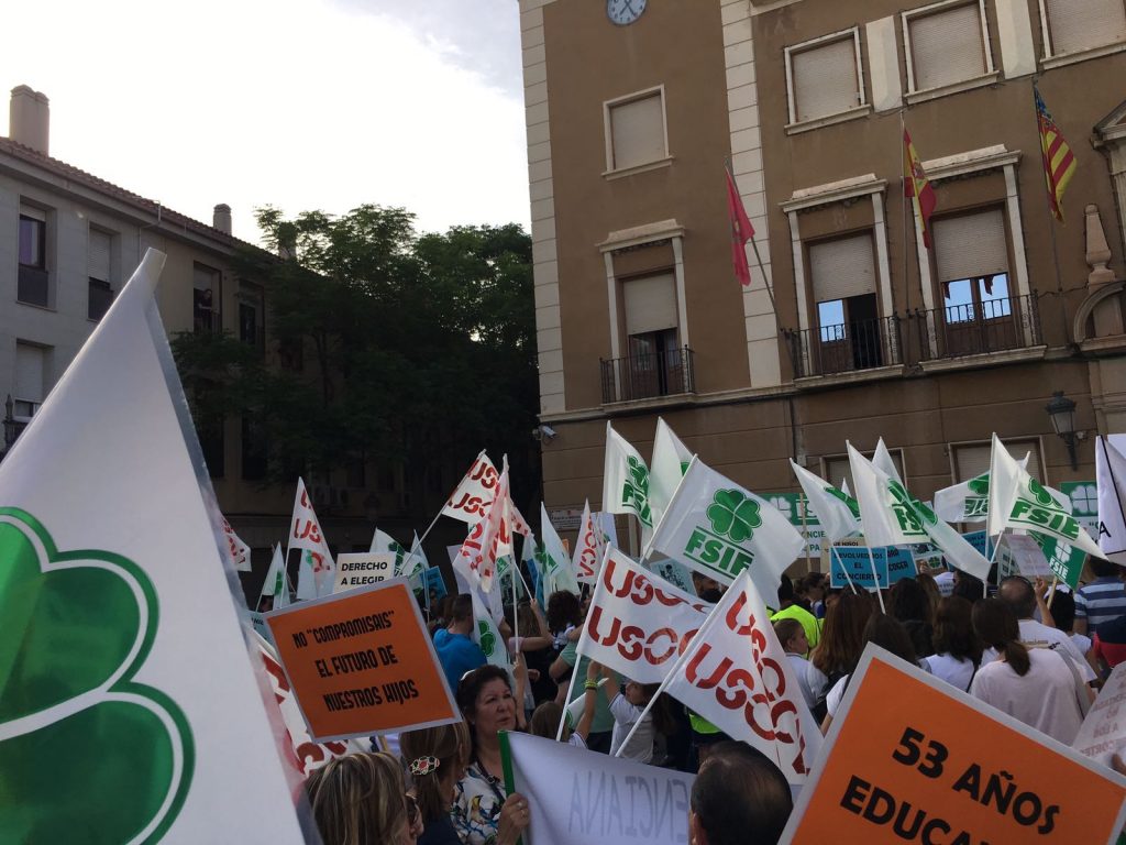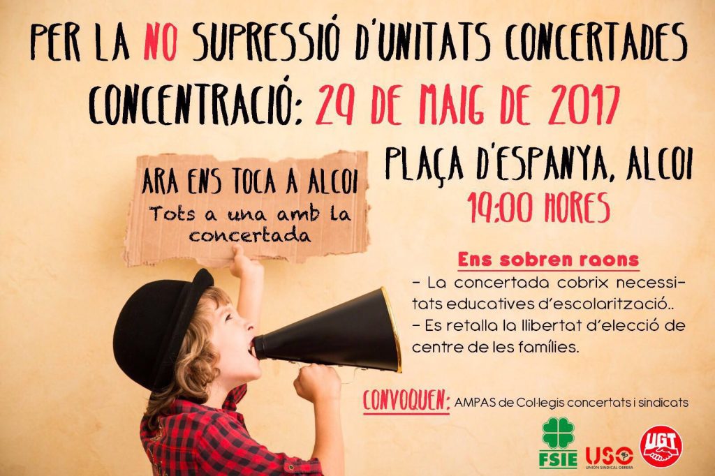 En la tarde del 26 de Mayo de 2017 el Colegio Apa La Encarnación de Villena se sumó a la concentración celebrada en la Plaza del Ayuntamiento de Elda y que fue convocada por los trabajadores del Colegio Sagrada Familia de Elda, con el fin de protestar por la supresión de aulas concertadas llevada a cabo por la Conselleria de Educación y a favor de la libertad de elección de centro por parte de los padres. La concentración estuvo apoyada además por otros colegios concertados de la comarca, como los de Carmelitas de Sax y de Elda y Calasancio de Monóvar, así como los sindicatos USO y FSIE.