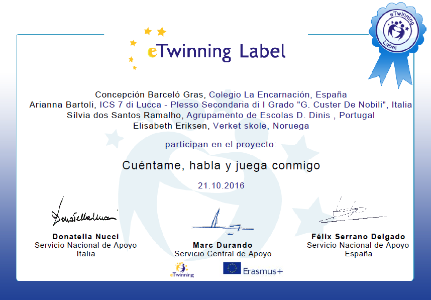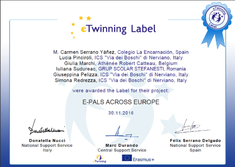 Los alumnos de 2º y un grupo de 1º están desarrollando el proyecto E-PALS ACROSS EUROPE (en inglés) con chicos y chicas de su misma edad de centros en Italia ( ICS «Via dei Boschi» di Nerviano ), Rumania (GRUP SCOLAR STEFANESTI, Ștefănești) y Bélgica Athénée Robert Catteau, Bruxelles). Participan un total de 306 chicos y chicas.